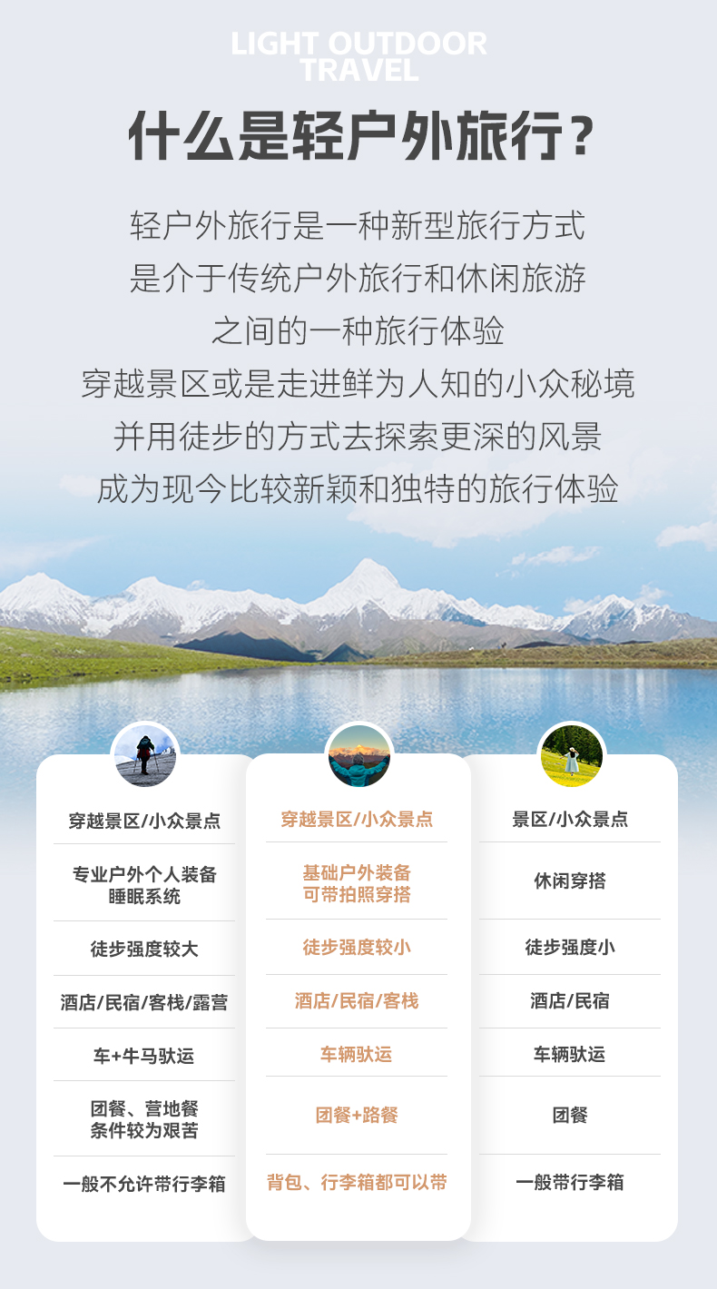 1.高原徒步活动不同于常规旅游团,重在全身心的体验,对参加队员的安全、体力、环保及团队协作精神要求较高;在活动过程中建议队员和队员之间互帮互助建立良好的友谊,队员和领队之间也建立好组织者和参与者的关系,领队做好本职服务和领队职责,队员需要在行程中尊重领队的意见和正确的决策,除此之外希望可以超越契约关系可以朋友相处,会让整个行程更加轻松愉快。