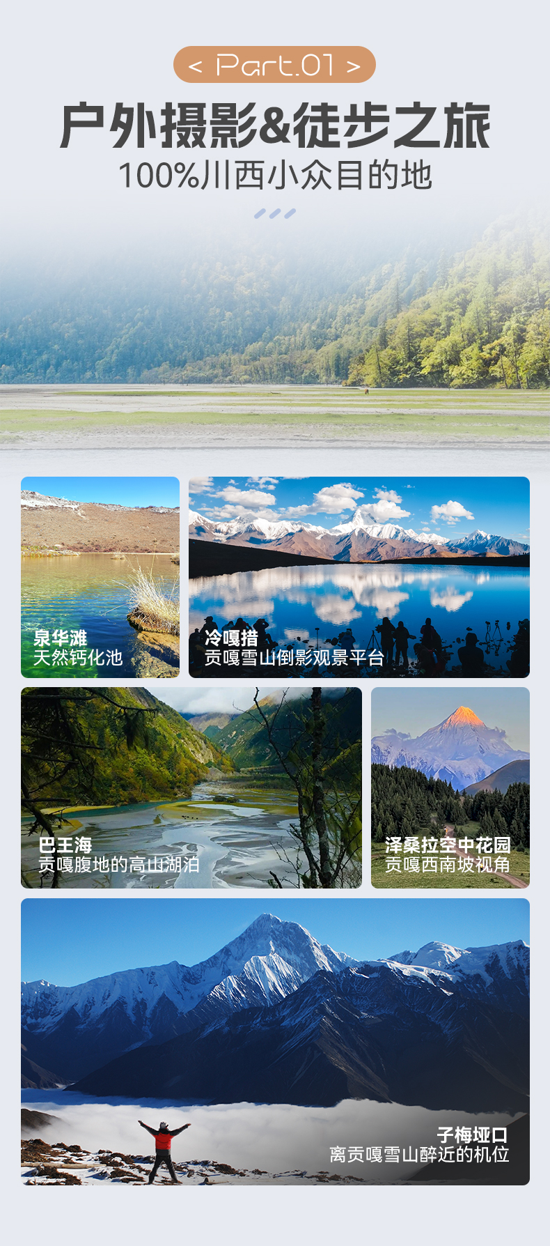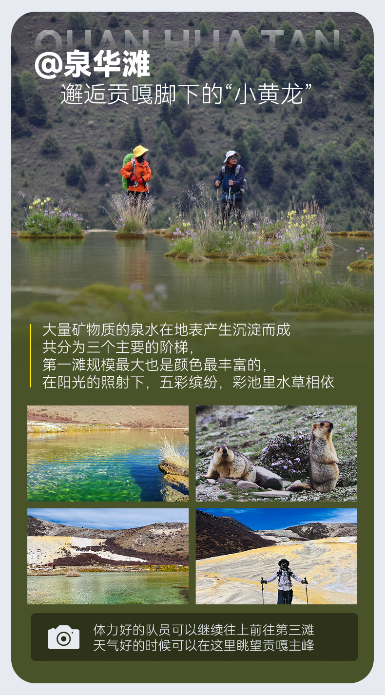 D3甲根坝-(车程约110公里,往返徒步约5公里)泉华滩-(车程约20公里)冷嘎措-(往返徒步约10公里)-玉龙西村/上木居