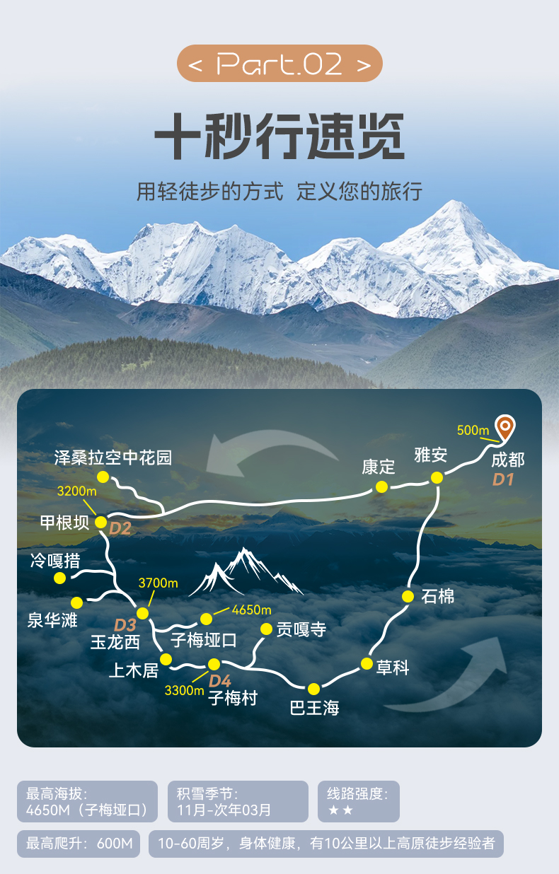 15.本次活动全线为高海拔地区,经过海拔最高为4650M的子梅垭口,平均海拔在4000M左右,请正确评估自己的身体情况做正确评估,以决定参加与否。