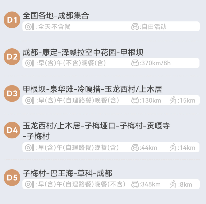全年组队,共35期,D1为成都集合日(全天抵达入住酒店即可)。节假日略有调整。