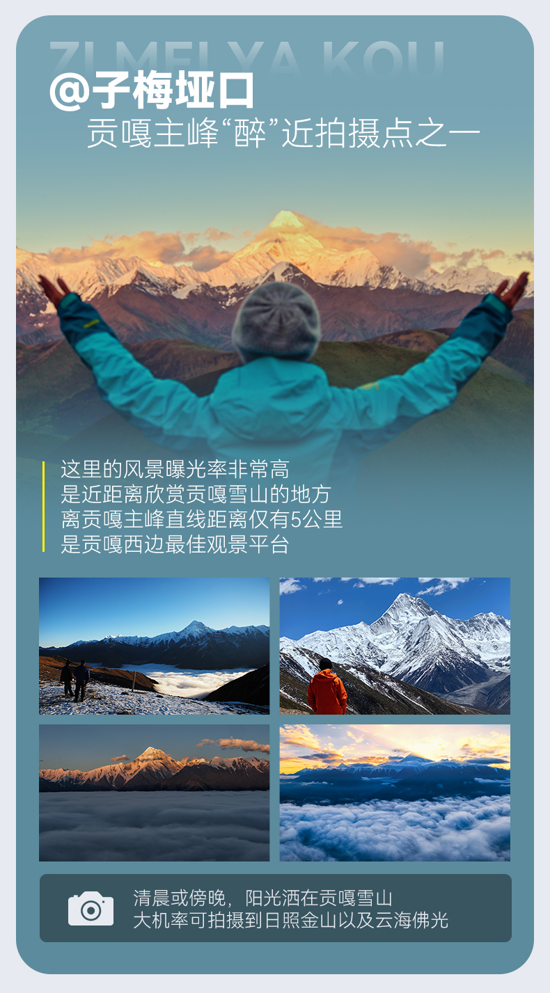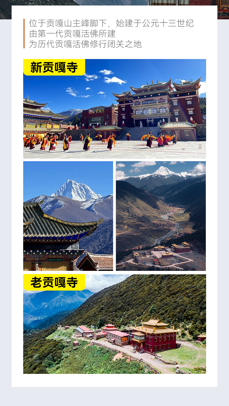 今日早起,收拾整备完毕,乘车前往子梅垭口观看日出,从另一个角度拍摄贡嘎山,也是离贡嘎最近的一个观景平台,可以在这里拍摄到星空云海、佛光日出,之后乘车下山前往子梅村,抵达今日住宿点,收拾行装后出发徒步前往贡嘎寺,贡嘎寺是一座有着700年历史的老寺庙,属藏传佛教的嘎举派(白教),这里也是贡嘎山登山大本营,这里能够近距离朝圣贡嘎雪山,在寺庙朝拜祈福后原路返回子梅村住宿。