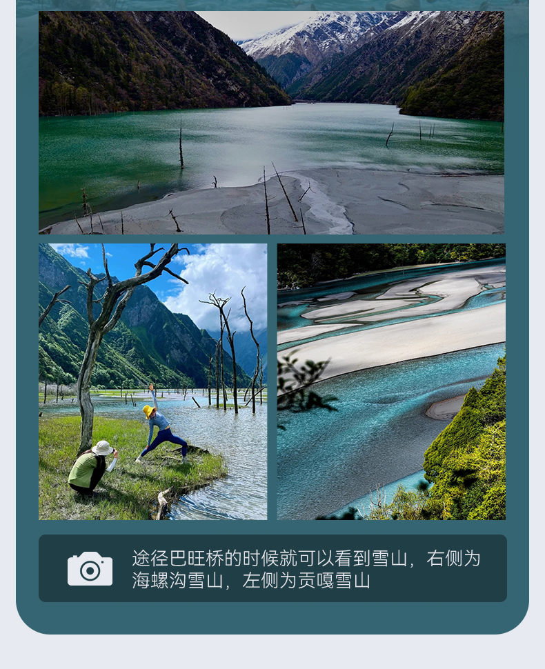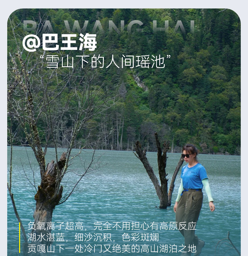 早餐后沿着河谷乘车顺流而下抵达巴王海。在到达巴王海后,雪山湖泊满足你对于世间一切的小庆幸。咱们一边走一边拍,在巴王海湖边吃午餐,休整后,整队出发,一鼓作气抵达巴王海停车场。这里也是徒步终点,坐上等候我们的专车沿田湾河经草科上高速,直达成都散团。