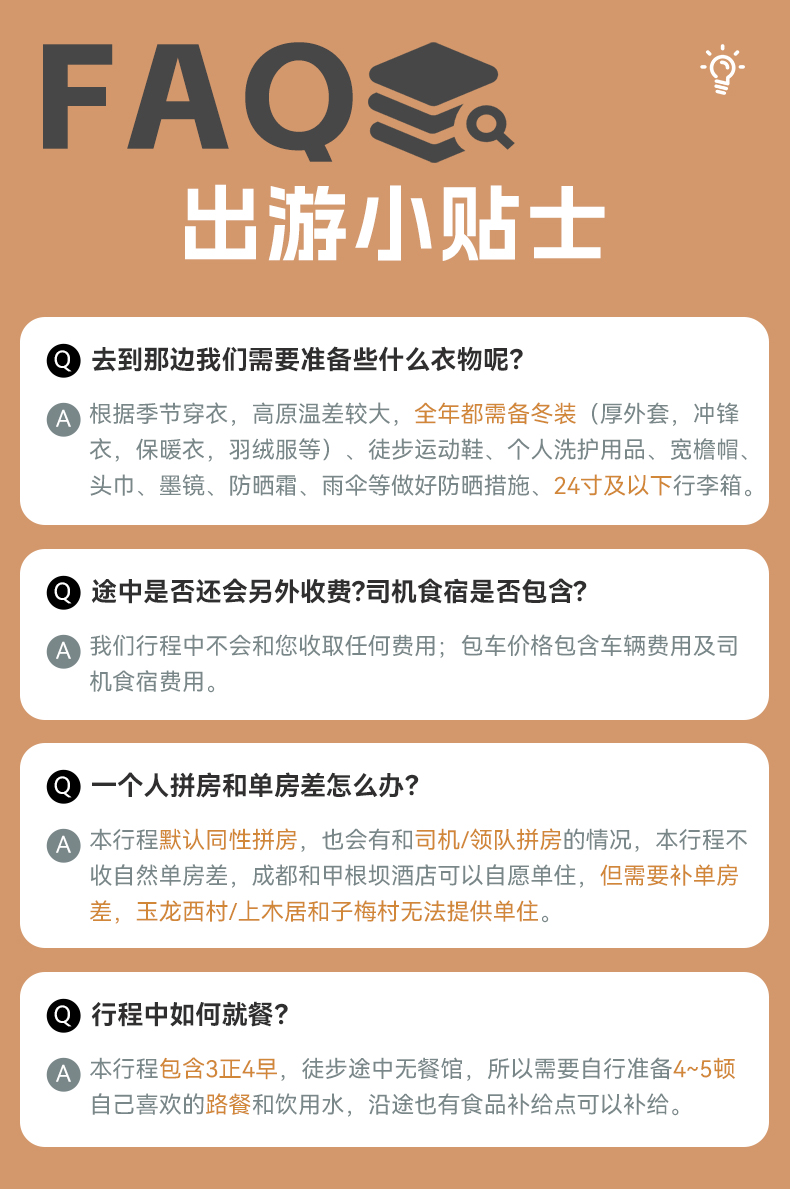 1.如路遇折多山天气恶劣、交通管制等情况为保证行程体验可临时调整为康定住宿;