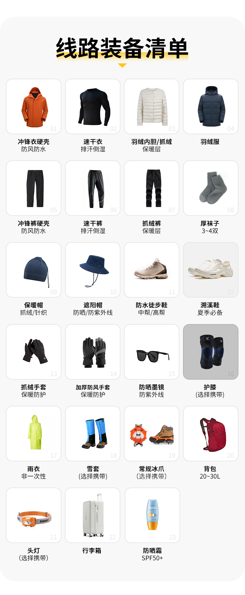 12.充电宝(建议20000mA左右,徒步路线较为原始基本上无电源补给)