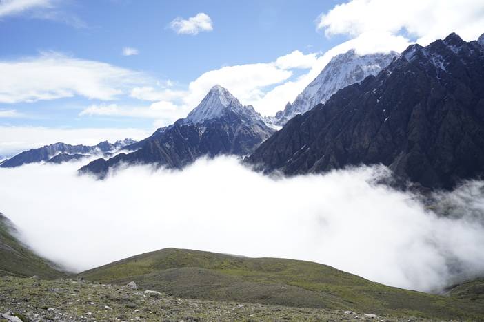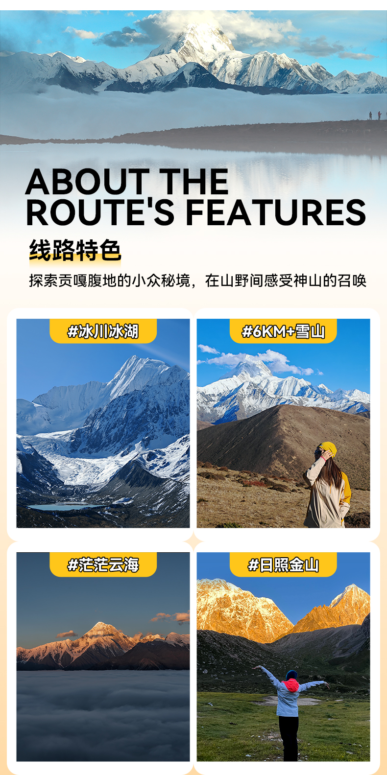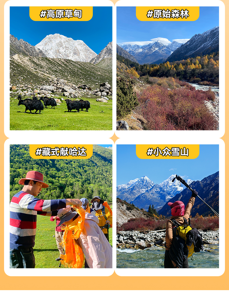 今天是艰苦的一天,翻越4980米的日达曼垭口,这个垭口鲜有人知,更别说走过的人少之又少,翻过垭口一路沿着河谷下降,抵达日达曼牧场,到这里我们本次露营就结束了,合照留影,再乘车前往客栈休息,下午乘坐当地中转车前往子梅垭口观贡嘎日落,运气好的话还可以看到日照金山等壮观景象。