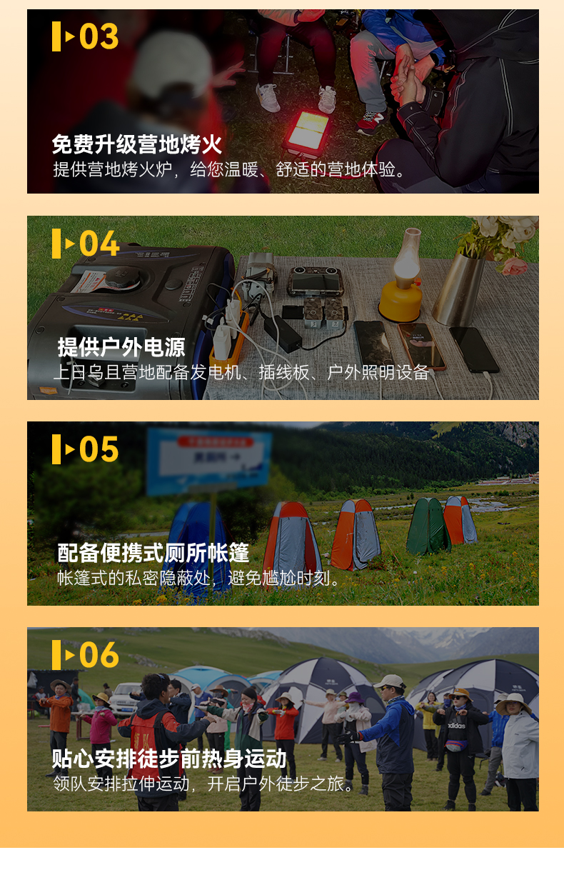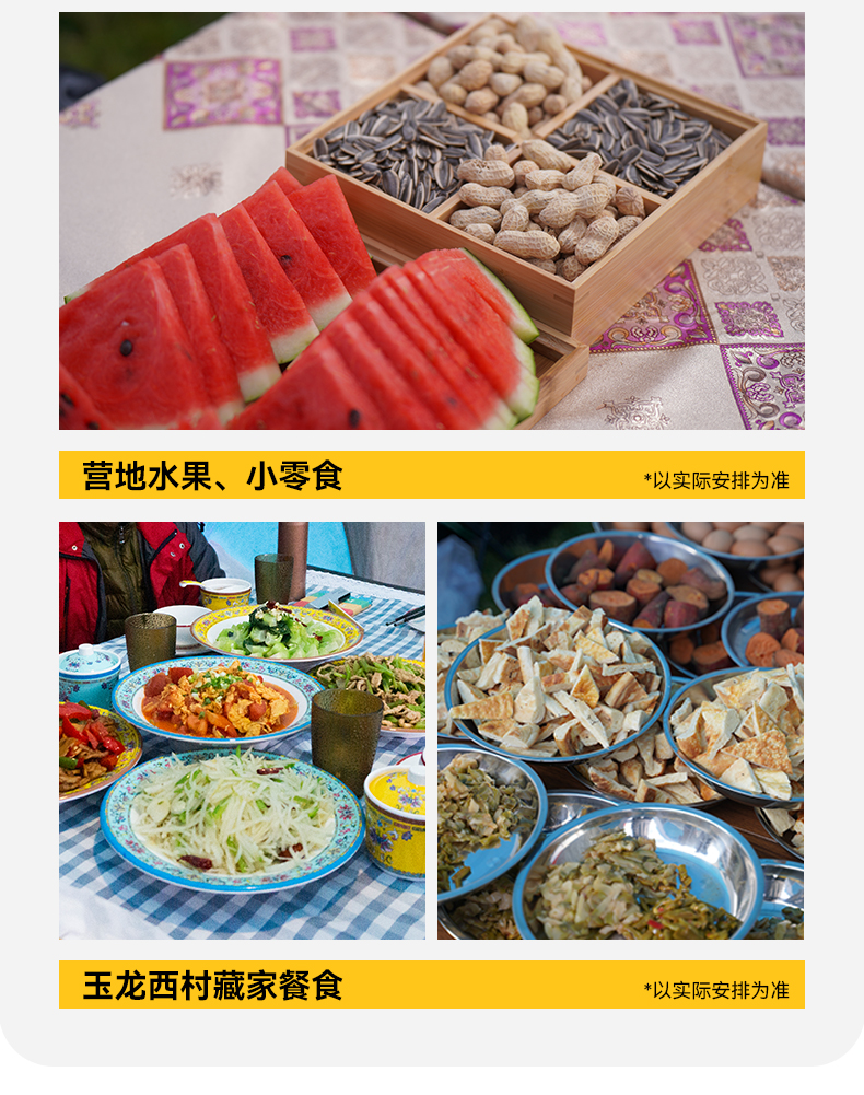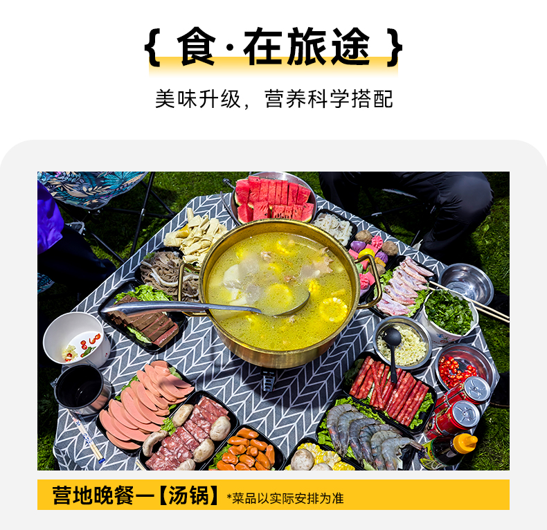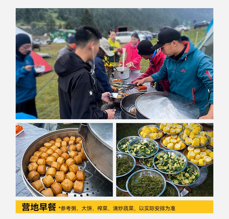 3.餐食:全程所列餐食合计4正4早,包含营地早餐、晚餐。营地晚餐为汤锅,营地早餐为粥、大饼、榨菜、清炒蔬菜等。