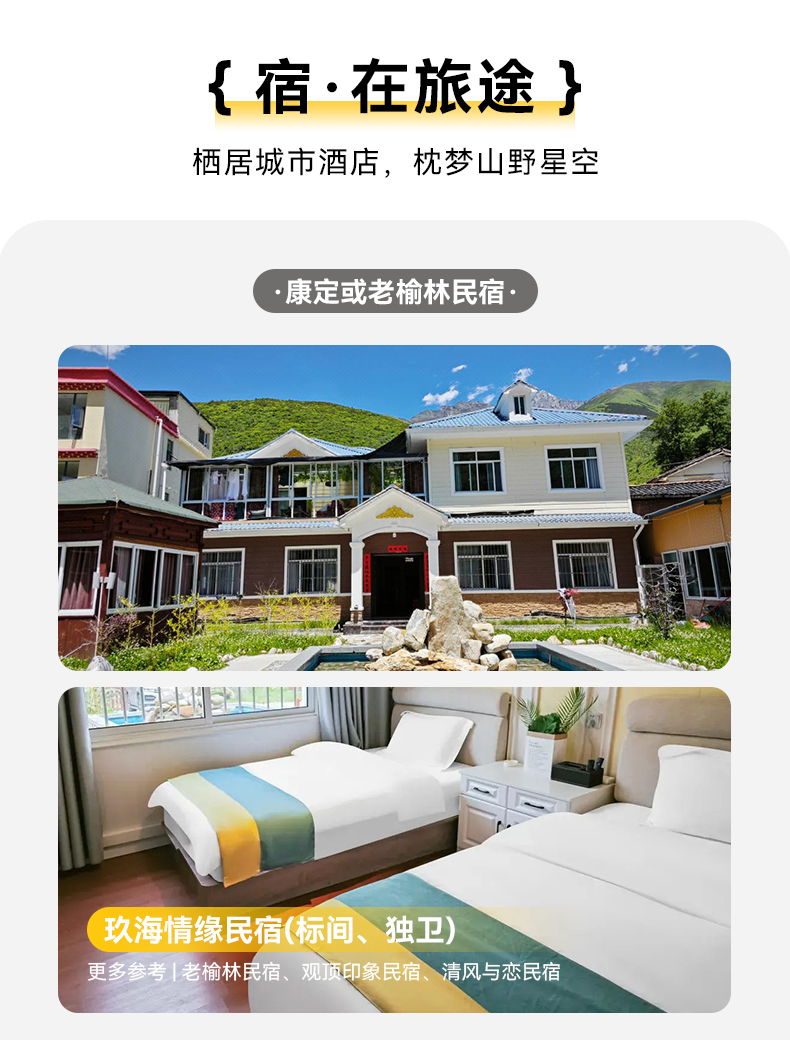 (其中:①老榆林或康定住宿标间1晚;②玉龙西村藏家客栈2-3人间2晚;③上日乌且营地帐篷通铺或者三人帐(2人1顶)