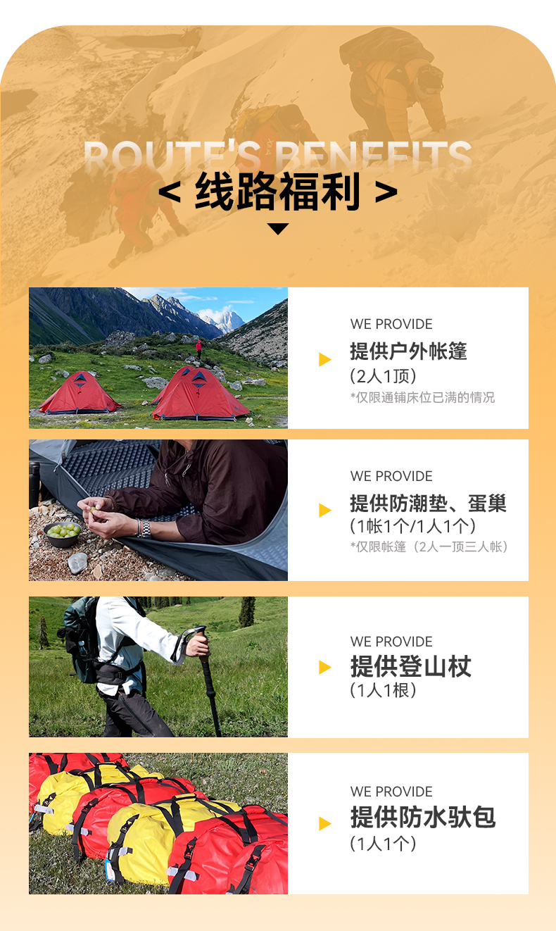 4.单房差:本行程不收自然单房差,如果队员要求自己全程住宿一间,则需要补单房差。单房差价格详见增值服务表格。