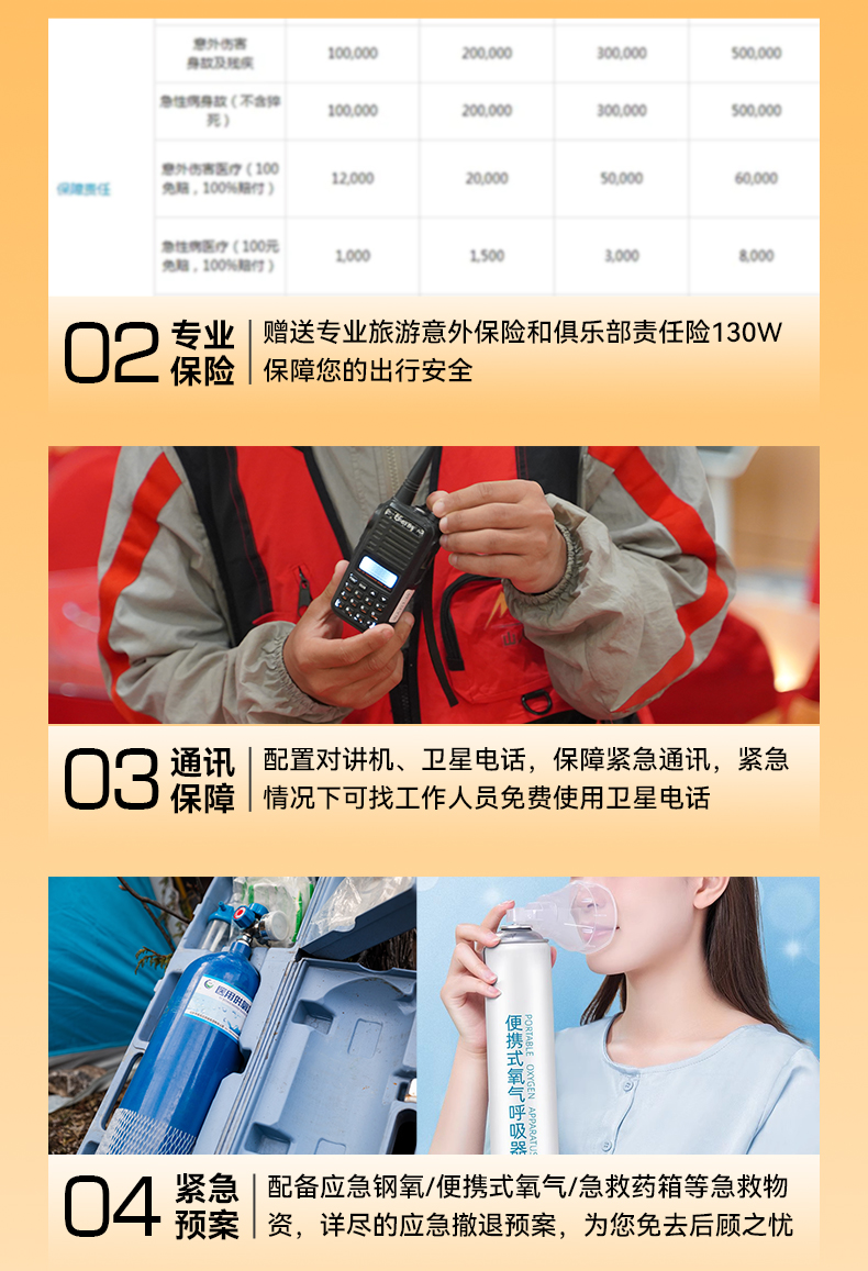 特别声明:工作人员因没有医疗资质,随车只提供瓶装氧气,提供常规感冒药品等,无其他特殊药品,请提前备足适合自己的药品。
