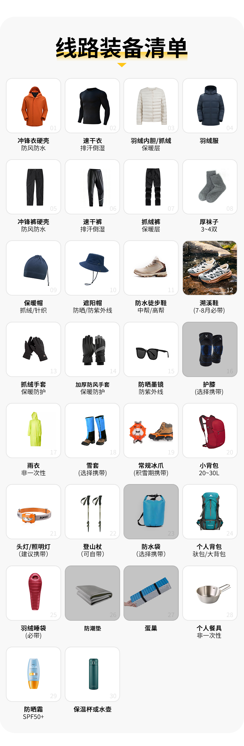 14.公用装备和个人当天活动中用不到的个人物资都通过马匹或牦牛驮运,只需自行做好打包避免丢失,动物驮运不建议在里面放精密电子仪器和贵重物品,预防损坏和遗失,当天只需要背负个人饮用水、干粮、雨具等用得到的物品。