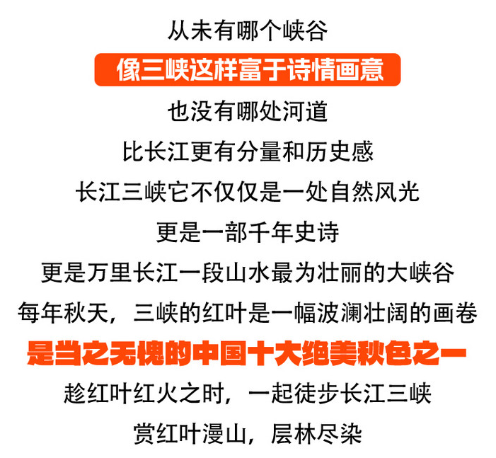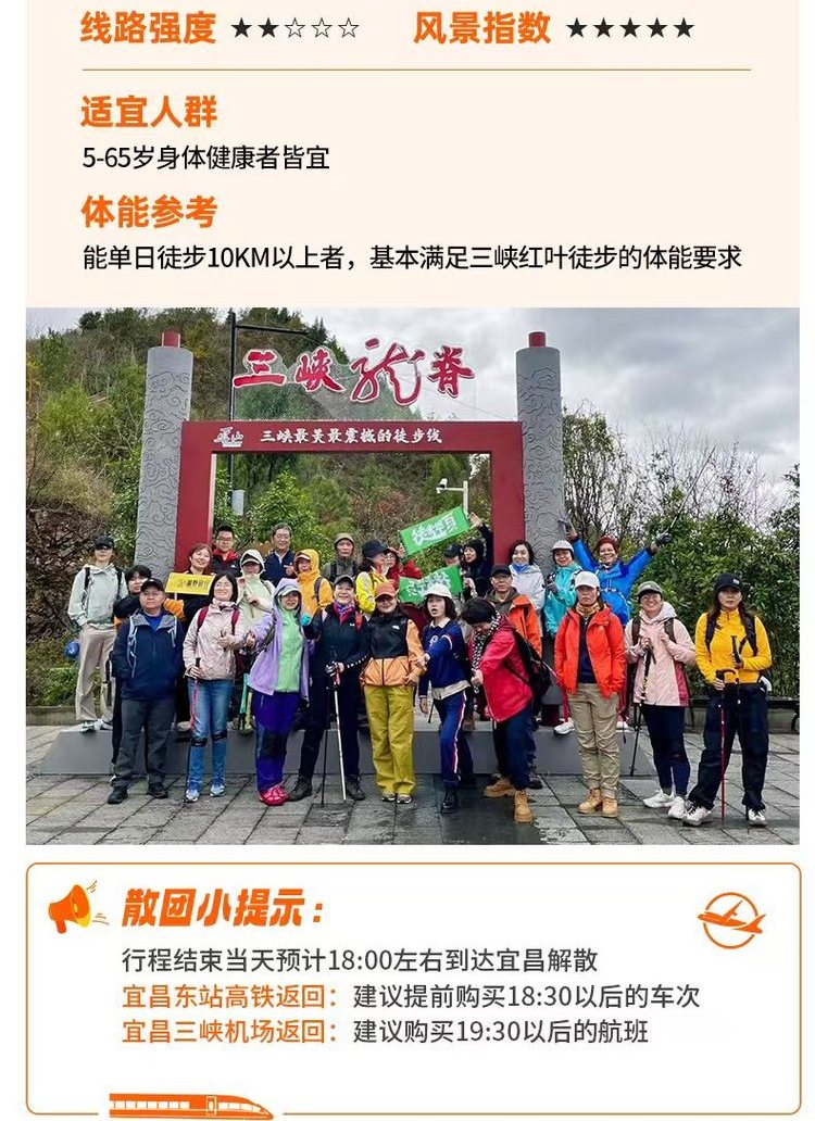 温馨提示:三峡地区风光优美,但部分路段山路较多,建议65岁以上老人及身体不适者在家人陪同下参加,并提前告知旅行社健康状况。