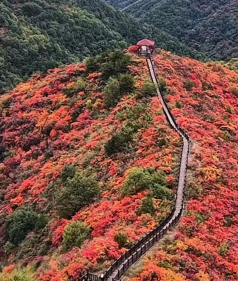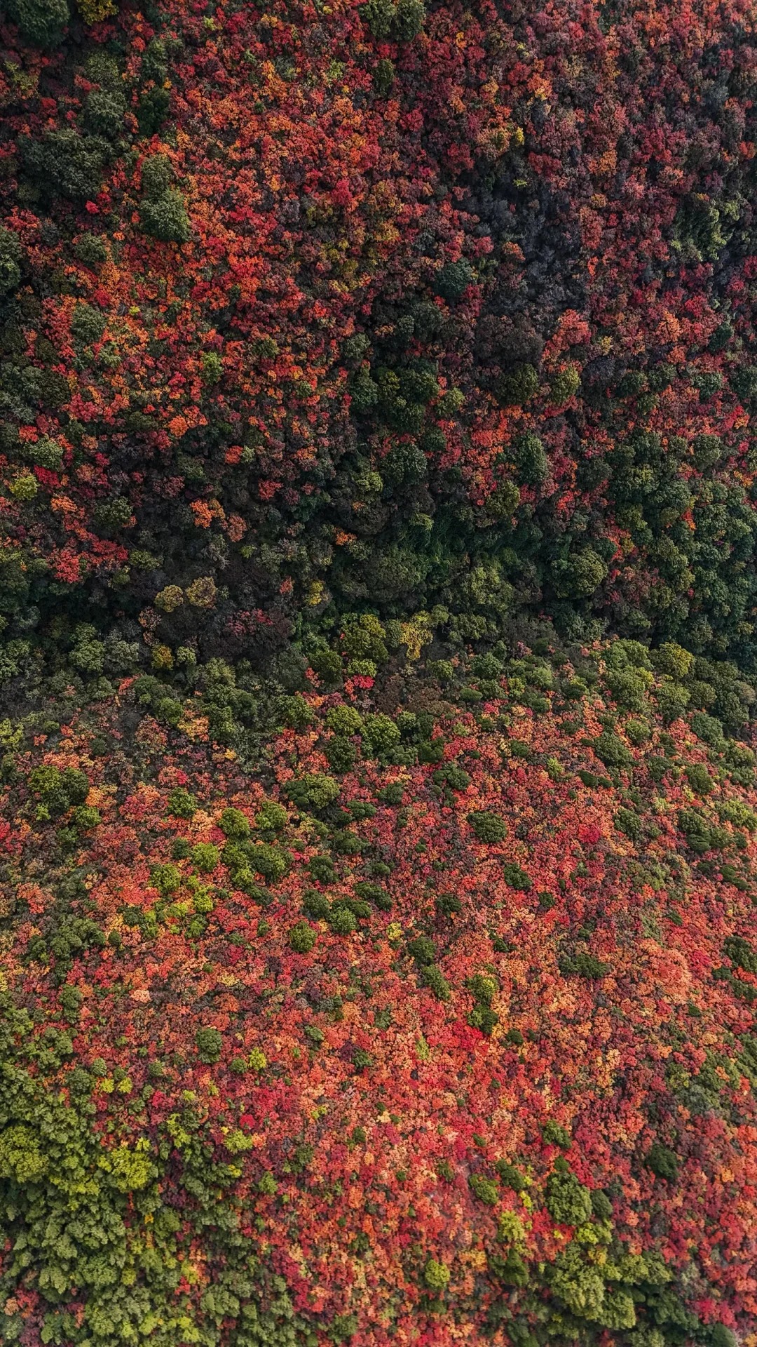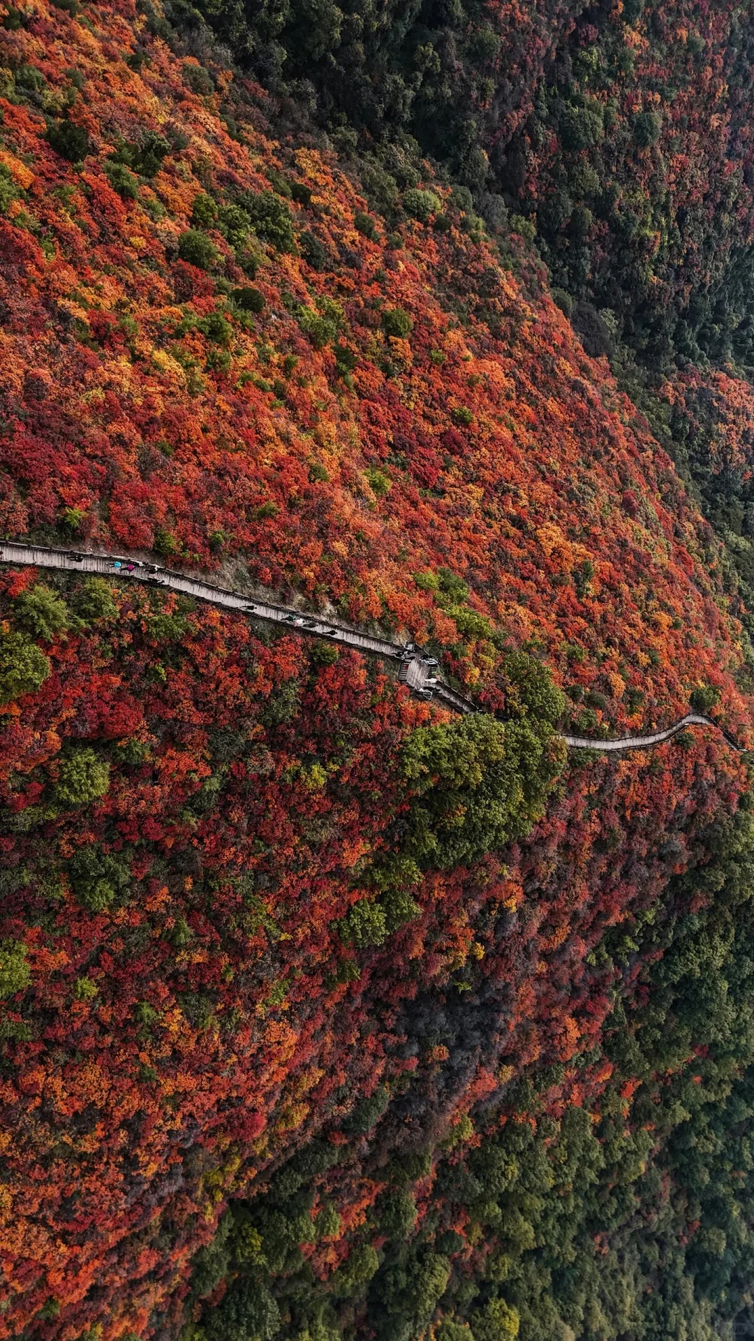 换上热烈的橙红、金黄,从山脚到山顶,层层叠叠的红叶像被大自然打翻了调色盘